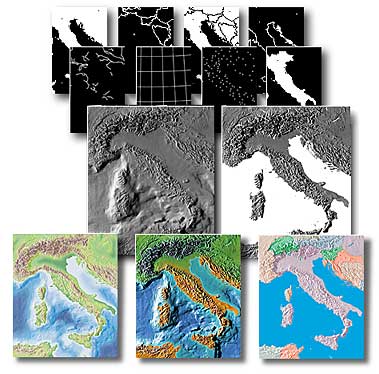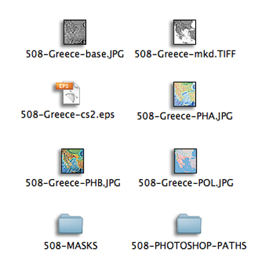 1. 78 high-resolution (300ppi), relief maps in four variations of colorization, plus vector paths and a variety of bitmap masks. The high resolution maps are all identified by the suffix ".JPG" or ".TIFF" as in "5.08 Greece-base.JPG" on Macintosh or "508GRE3B.JPG" in Windows The relief maps feature ocean floor relief as well as land relief. These are identified as follows:
