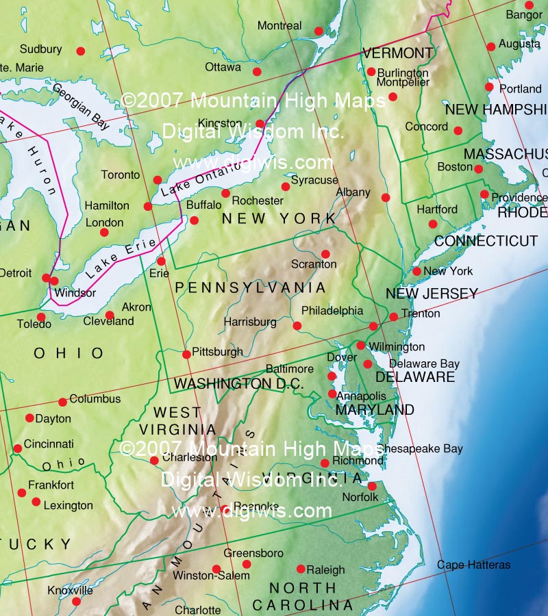 Example of the Mountain High Maps USA Illustrator Map #204 and Relief map This sample shows the Low Contrast Elevation style relief map placed in the bottom layer All states are individually layered and can be modified for fill color All map layers are editable in terms of line thickness, color, font sizes etc.. |